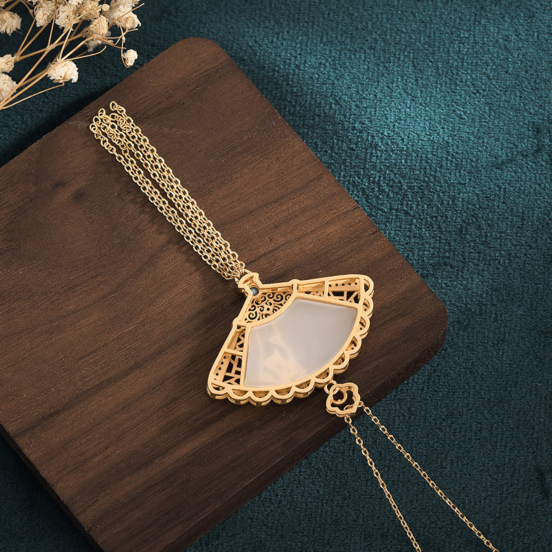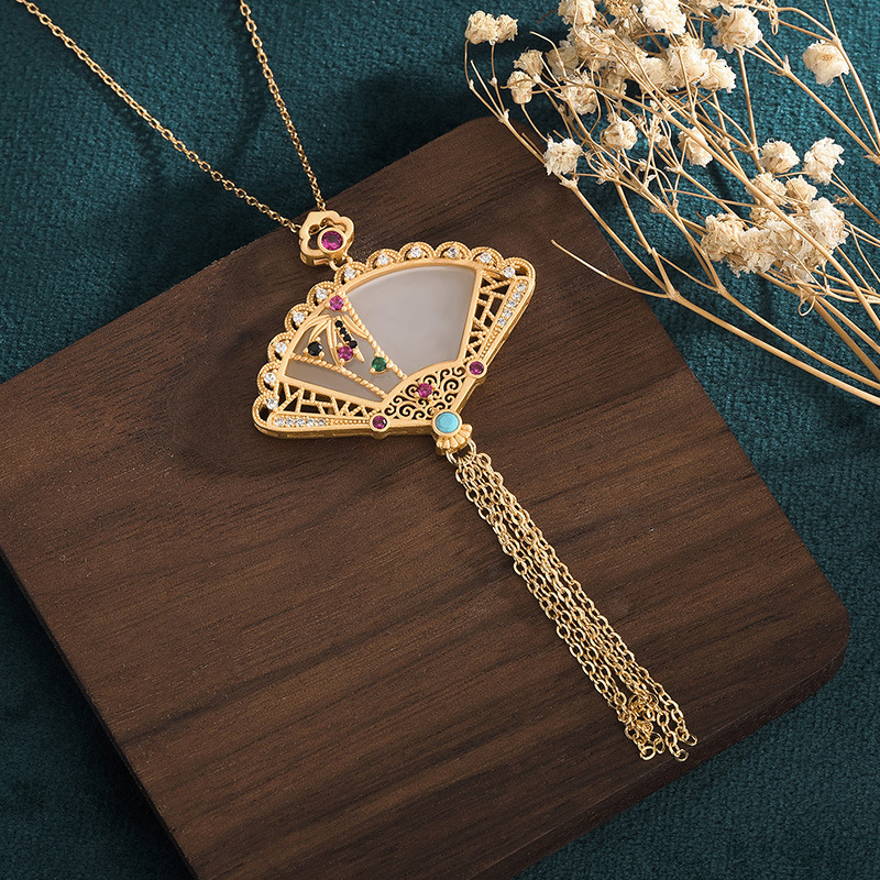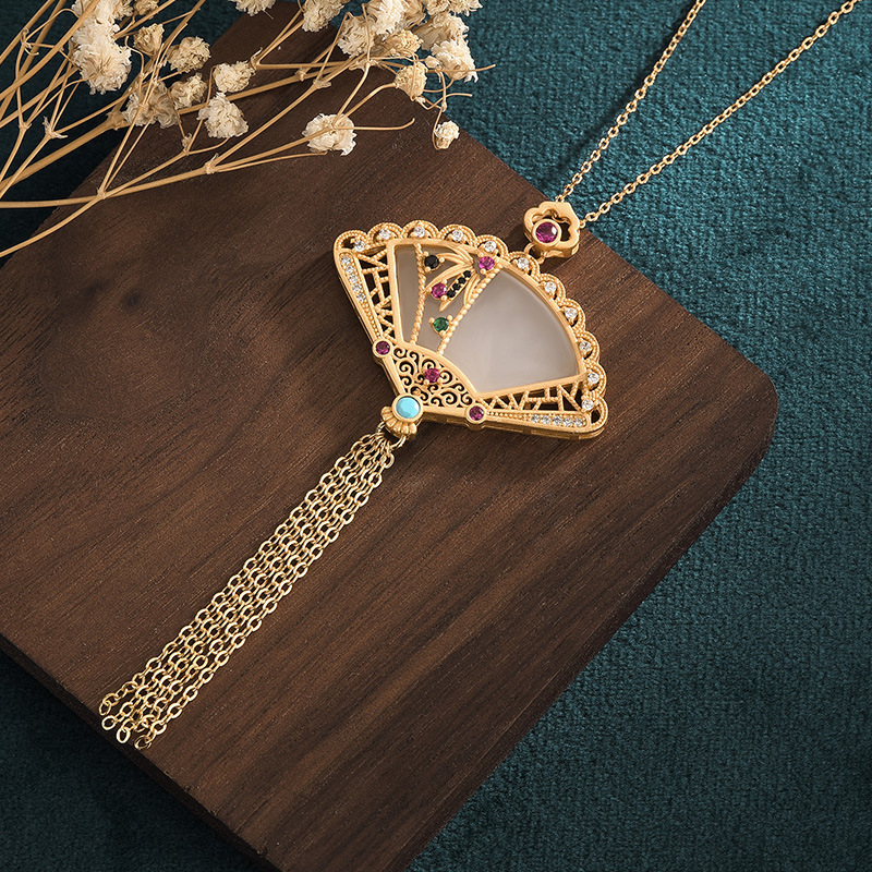 2021 Autumn and Winter New National Fashion Chinese Style Cheongsam Jewelry Neck Chain Imitation Hetian Jade Palace Fan Tassel Necklace Women