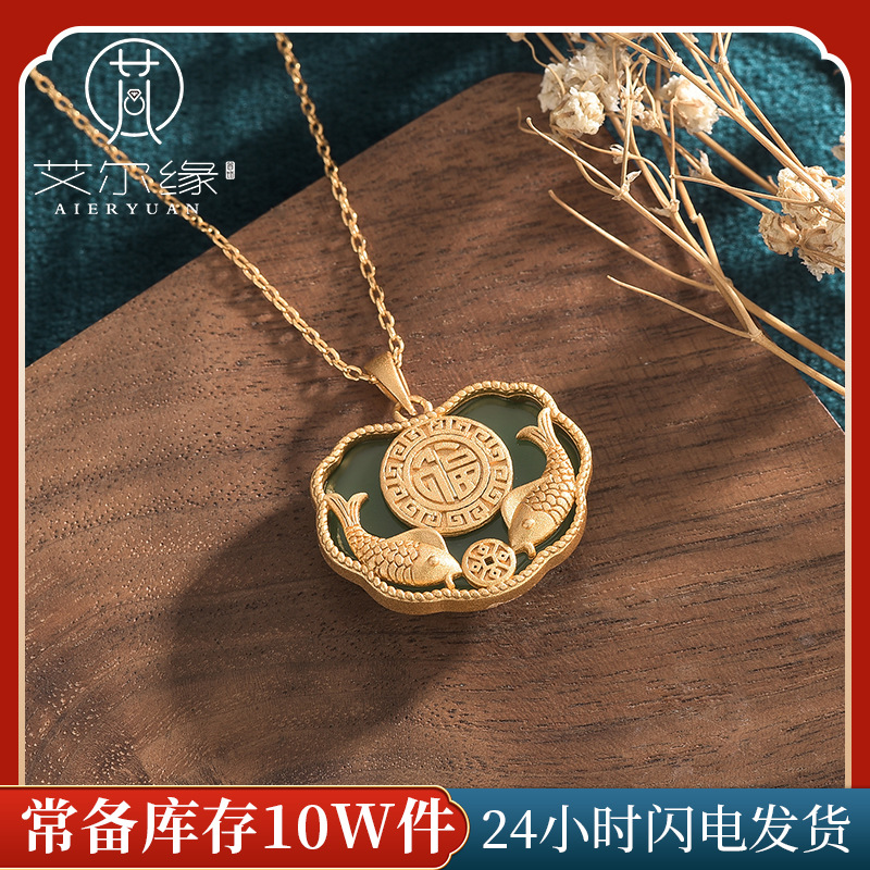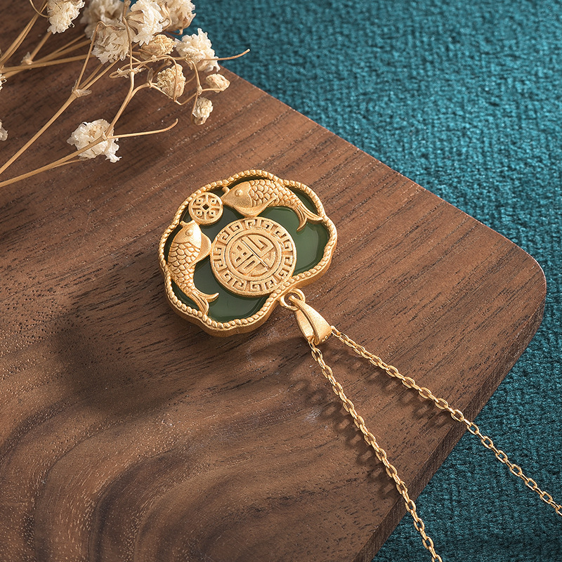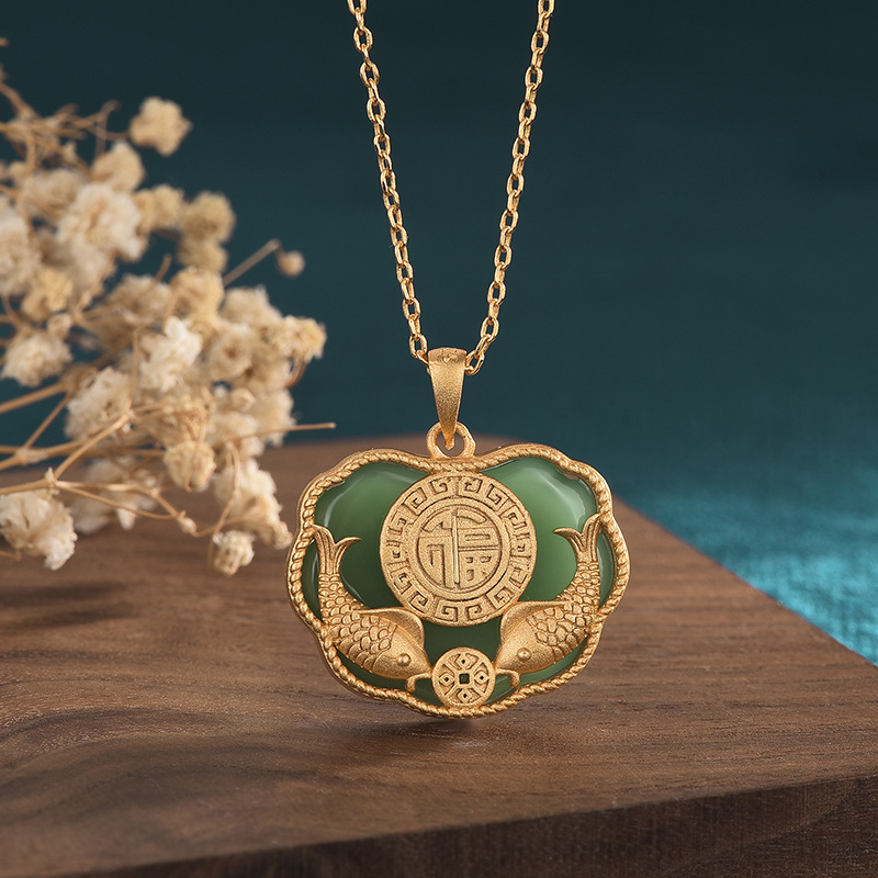 2021 Chinese Style Elegant Cheongsam Hanfu Accessories New Year Fish Peace Lock Pendant Imitation Hetian Jade Vintage Necklace