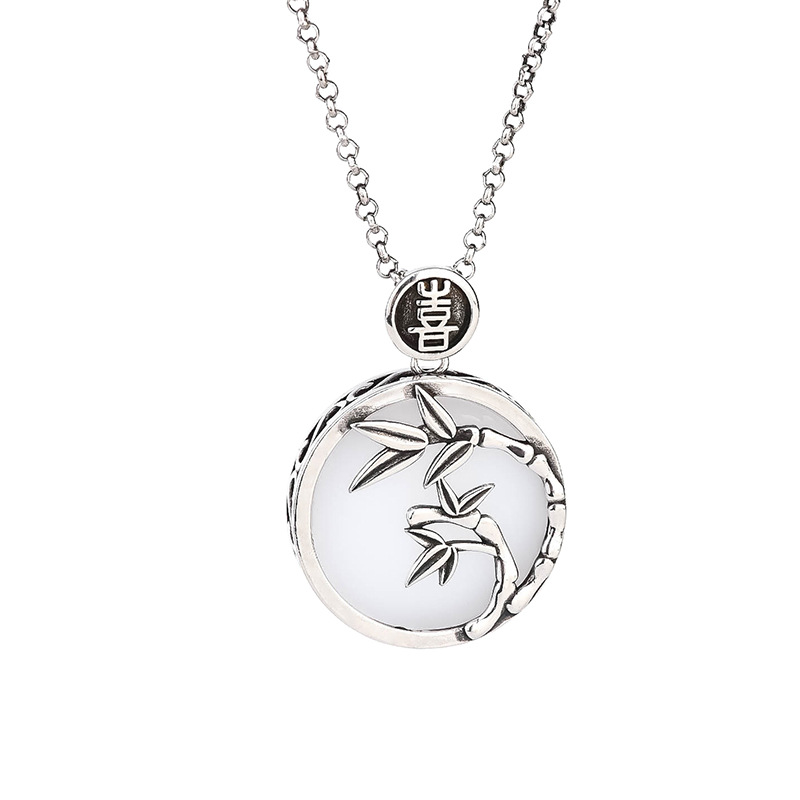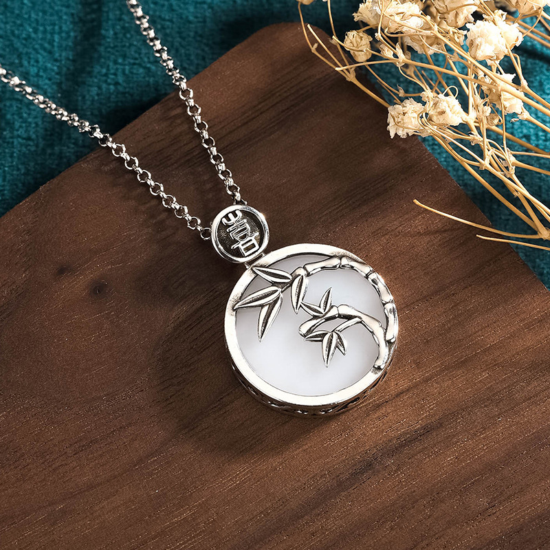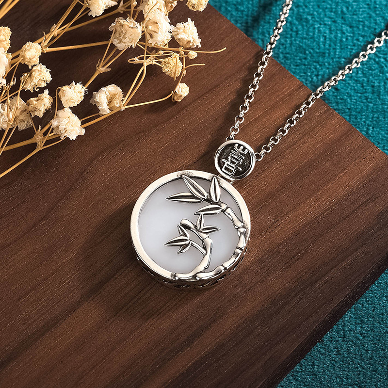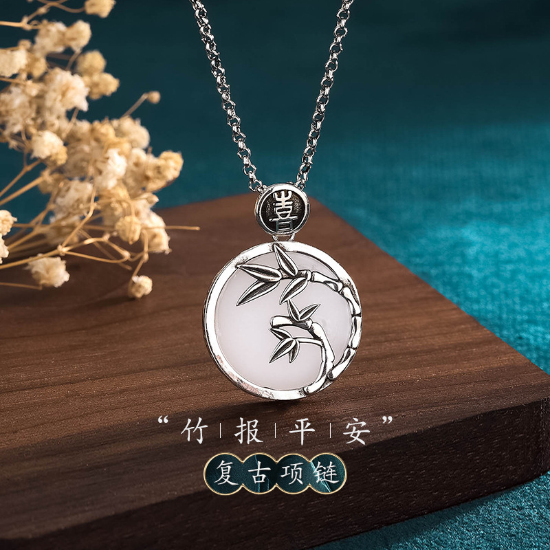 2022 national fashion new Thai silver craft bamboo newspaper safety inlaid imitation Hetian jade retro necklace mother birthday gift