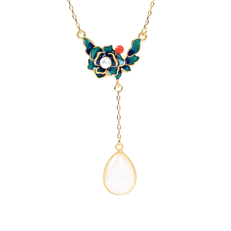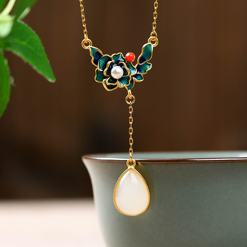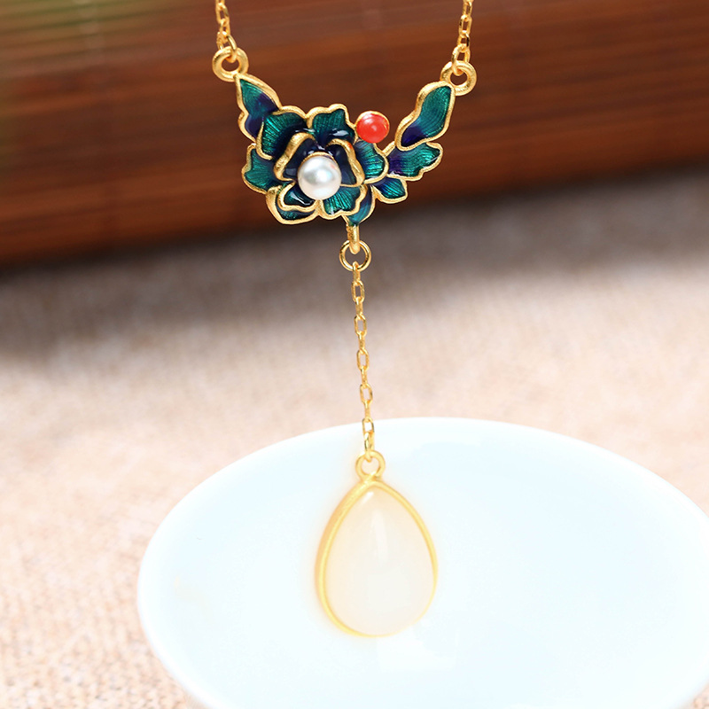 2022 National Tide Palace Vintage Accessories Cloisonne Gold-plated Glaze Peony Flower Water Drops Imitation Hetian Jade Pendant Necklace