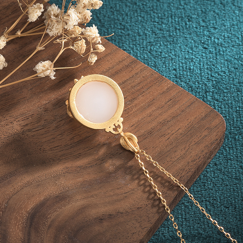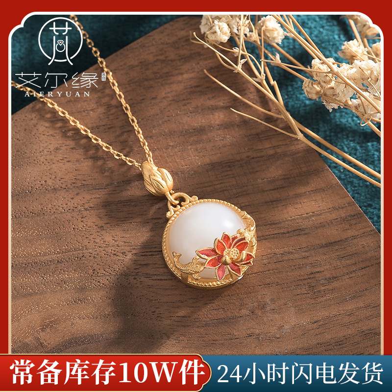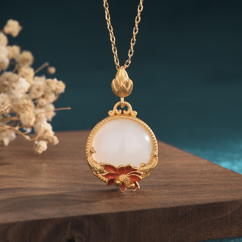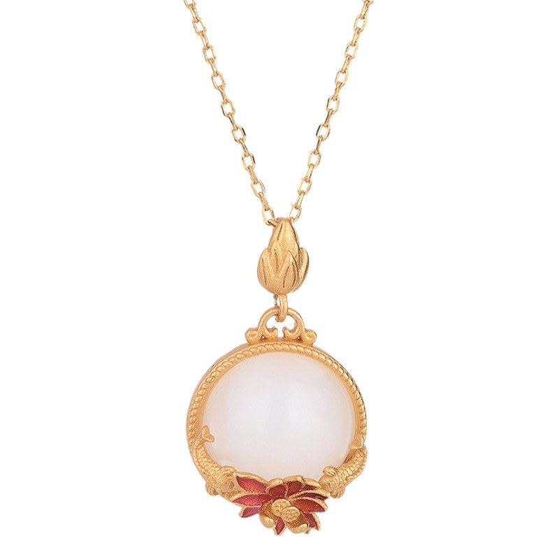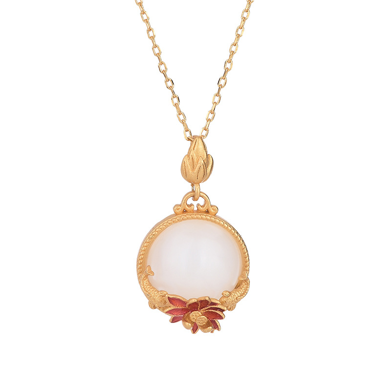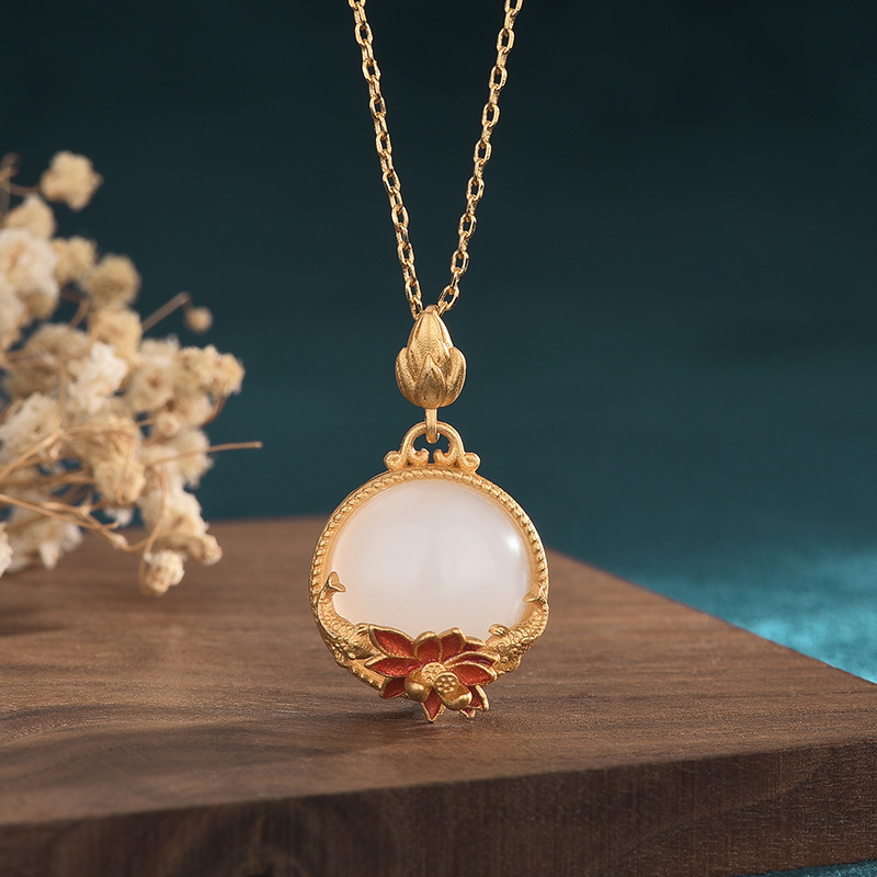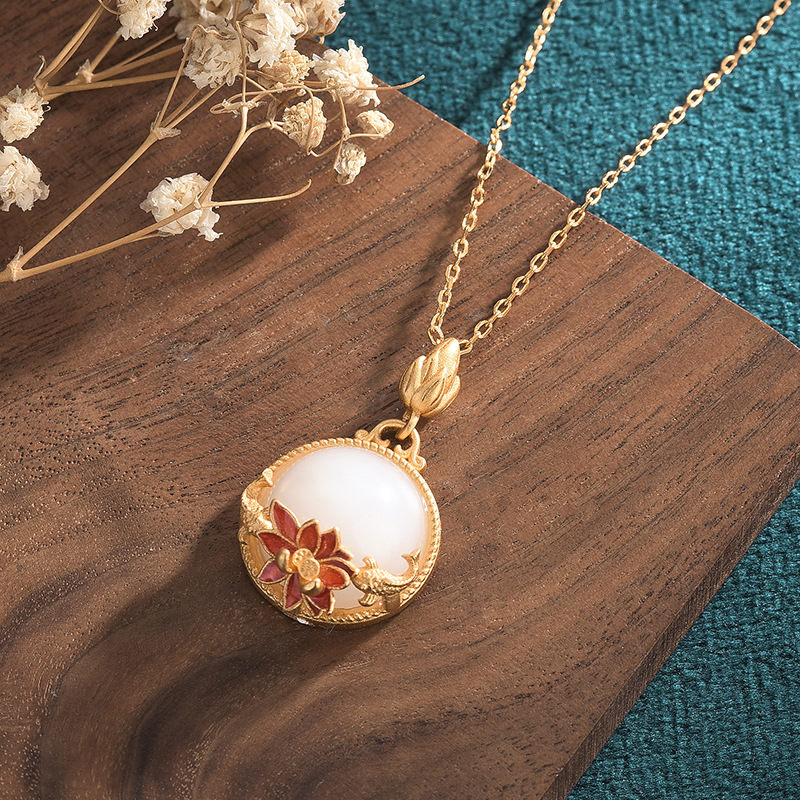 Al-Yuan Jewelry Live Supply Ancient French Gold Craft Enamel Lotus Pendant Imitation Hetian Jade Vintage Necklace Women