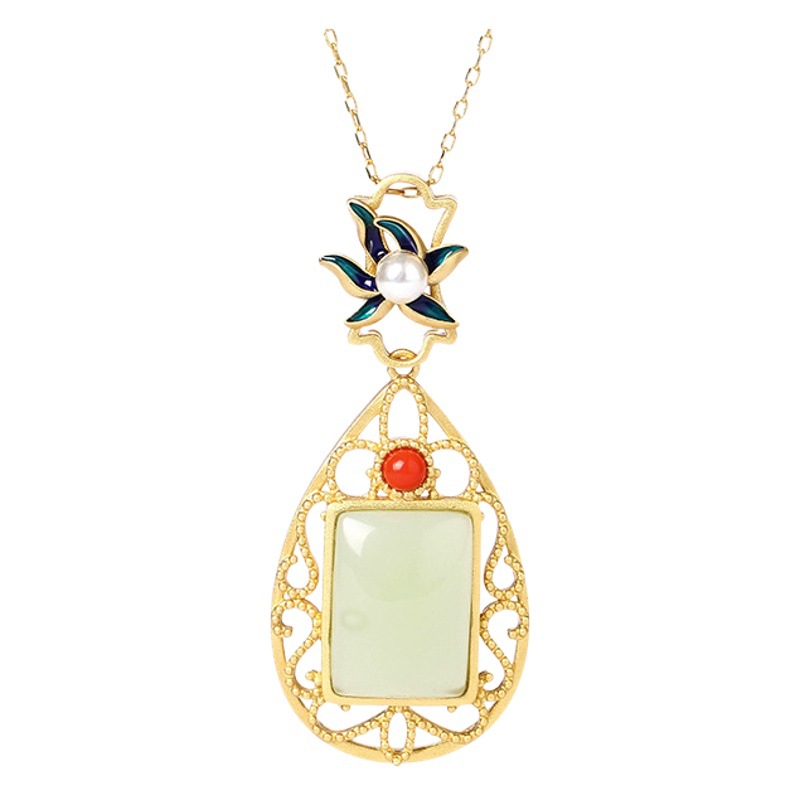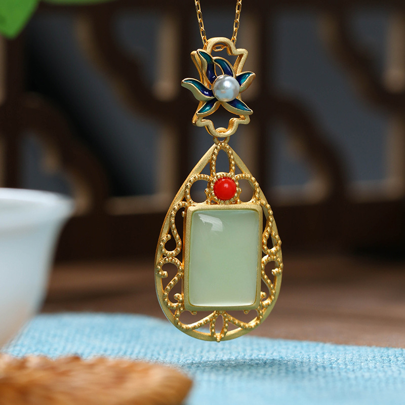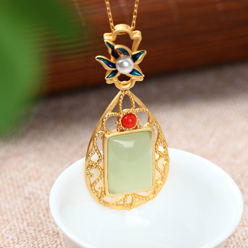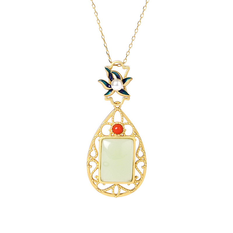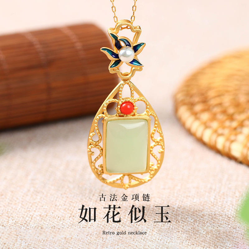 Al Yuan Nepal Gold Plating Craft National Fashion Imitation Hetian Jade Ruyi Vintage Necklace Clavicle Chain Mother’s Day Gift