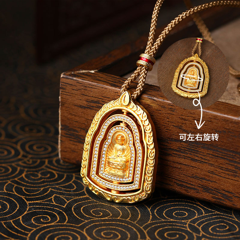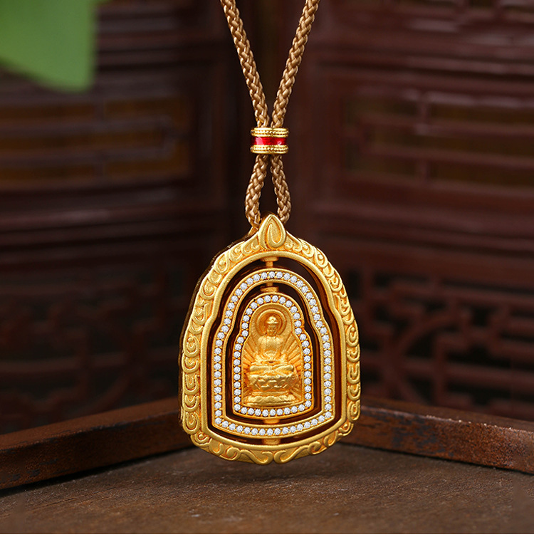 Ancient Gold Electroplating Chinese Style Color-Preserving Rotating Buddha Amulet Amitabha Buddha Guanyin Transfer Bead Round Pendant Necklace for Men and Women