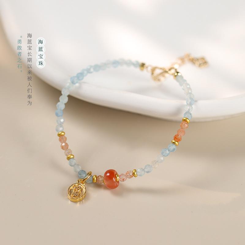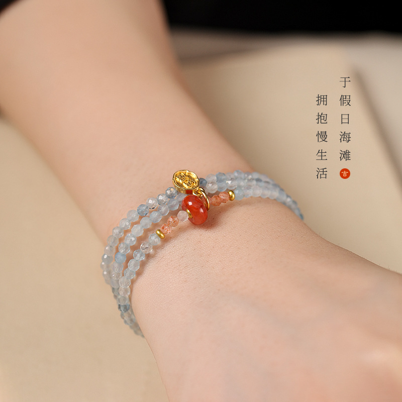 Auspicious Good Luck Guofeng Aquamarine 3mm Cut Face Bead Fine Single Circle Stacked Wrist Bracelet Clavicle Necklace