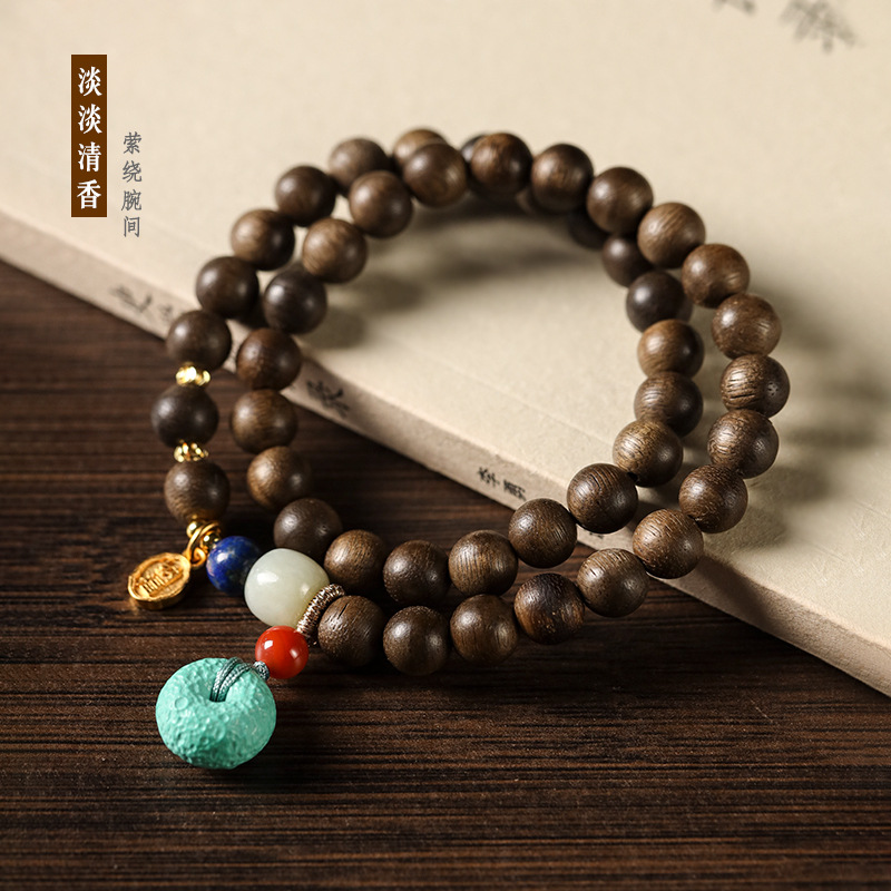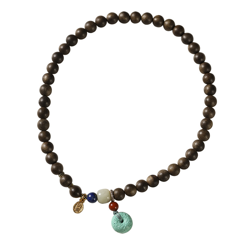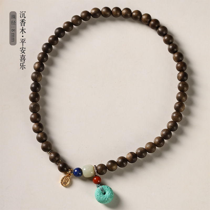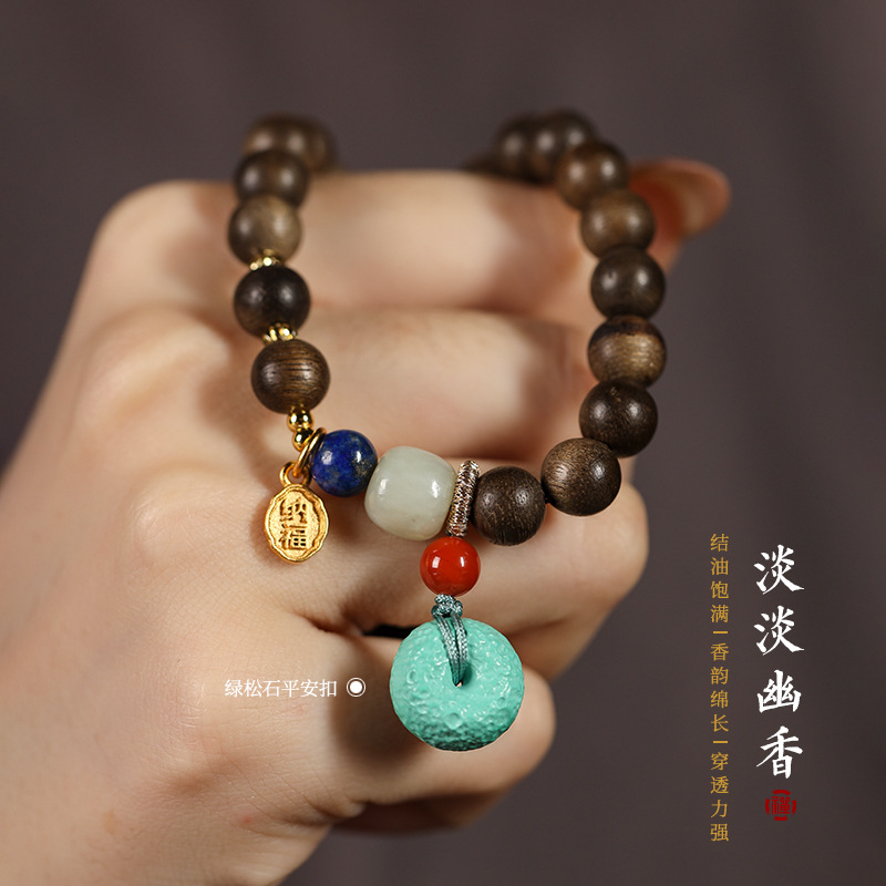Brunei Agarwood Black Oil Old Material Turquoise Ping An Buckle New Chinese Double Circle Style Folk Play Buddha Bead Handstring Men’s and Women’s Jewelry