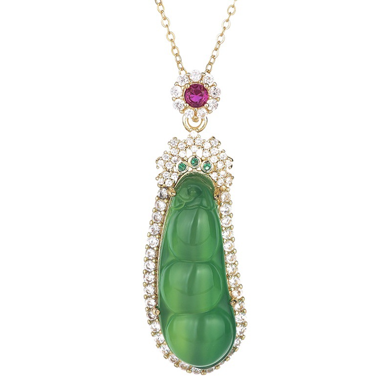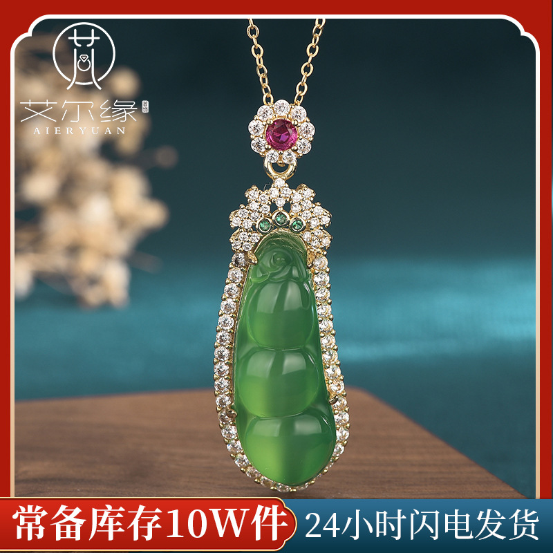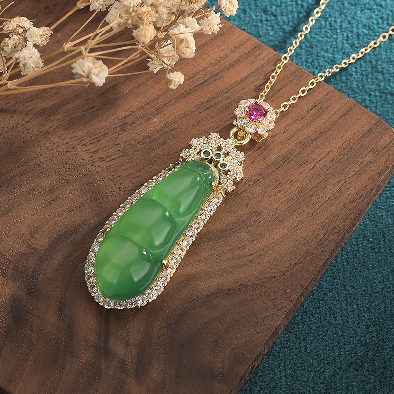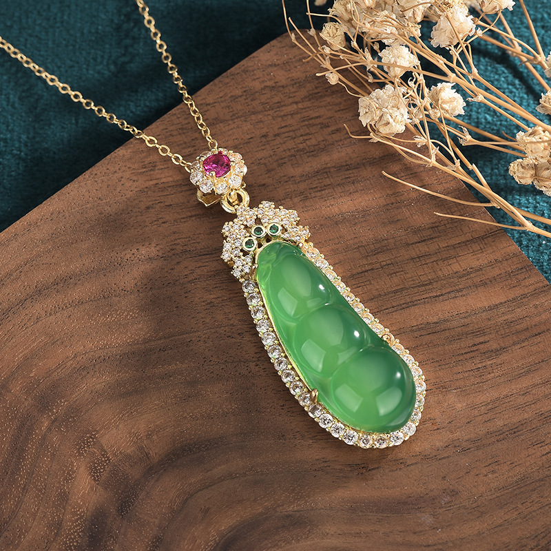 Chinese Style Ancient Costume Jewelry Ice Fluorescent Chalcedony Bean Pendant Inlaid with Green Jade Green Bean Jade Pendant Necklace for Women