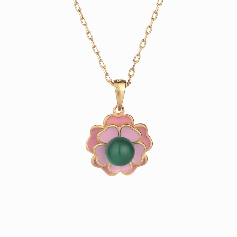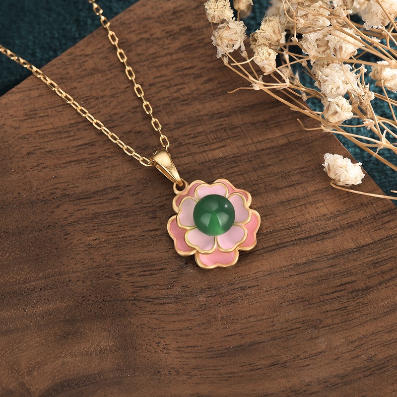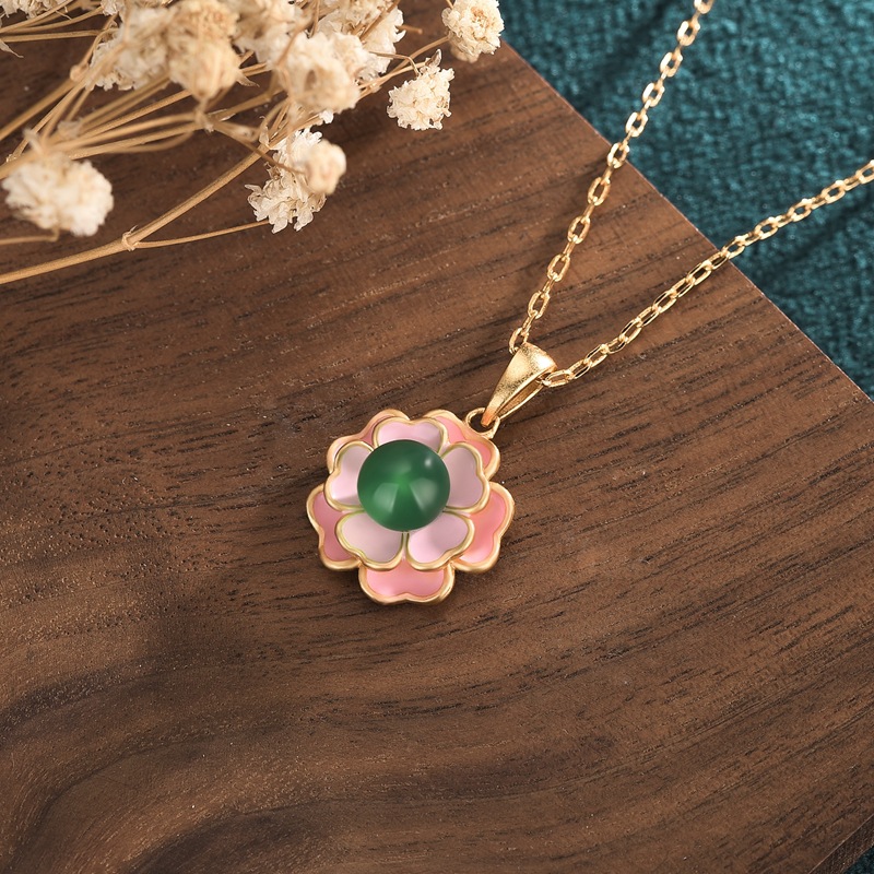 Chinese style palace style design copper gold-plated Camellia agate chalcedony pendant ancient Chinese clothing necklace necklace wholesale