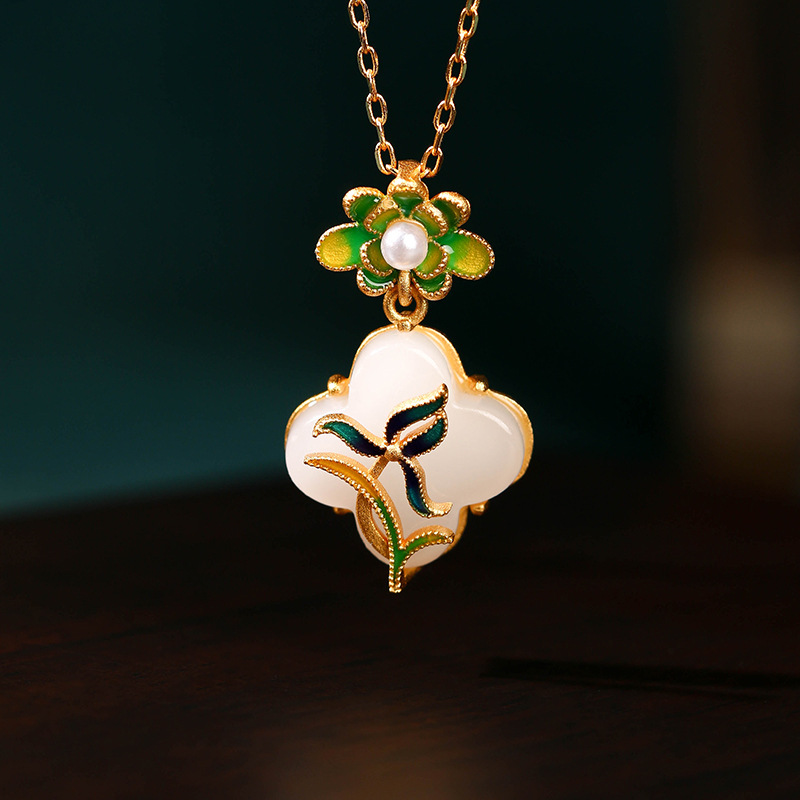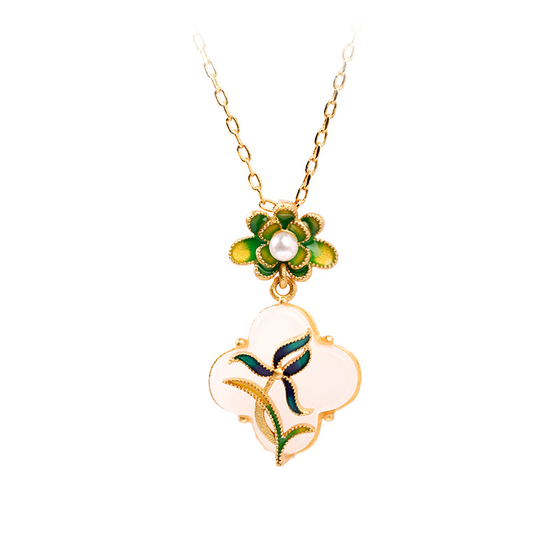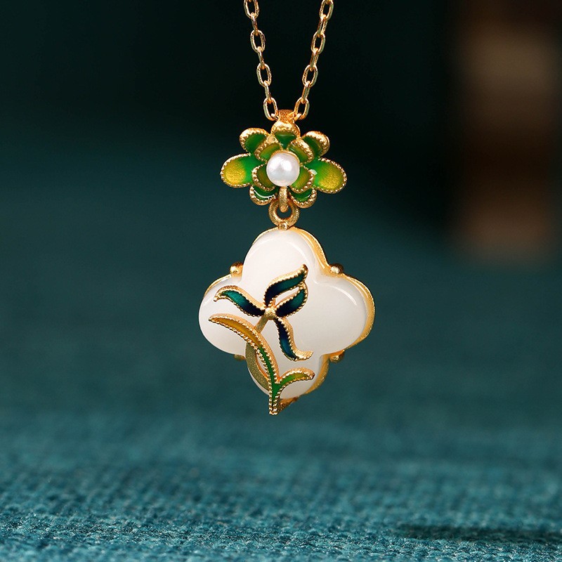 Elliot Chinese Style Ancient Method Gold Imitation Jade Pendant Women’s Summer High Sense Grade Four-leaf Clover Niche Collarbone Necklace Women