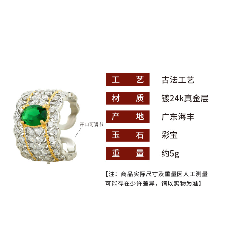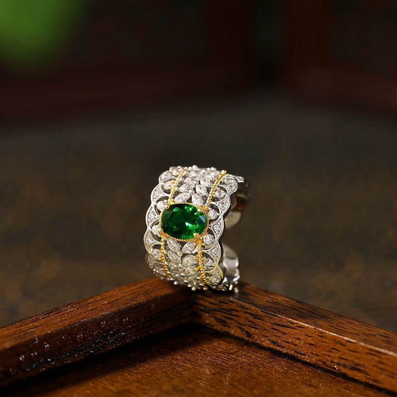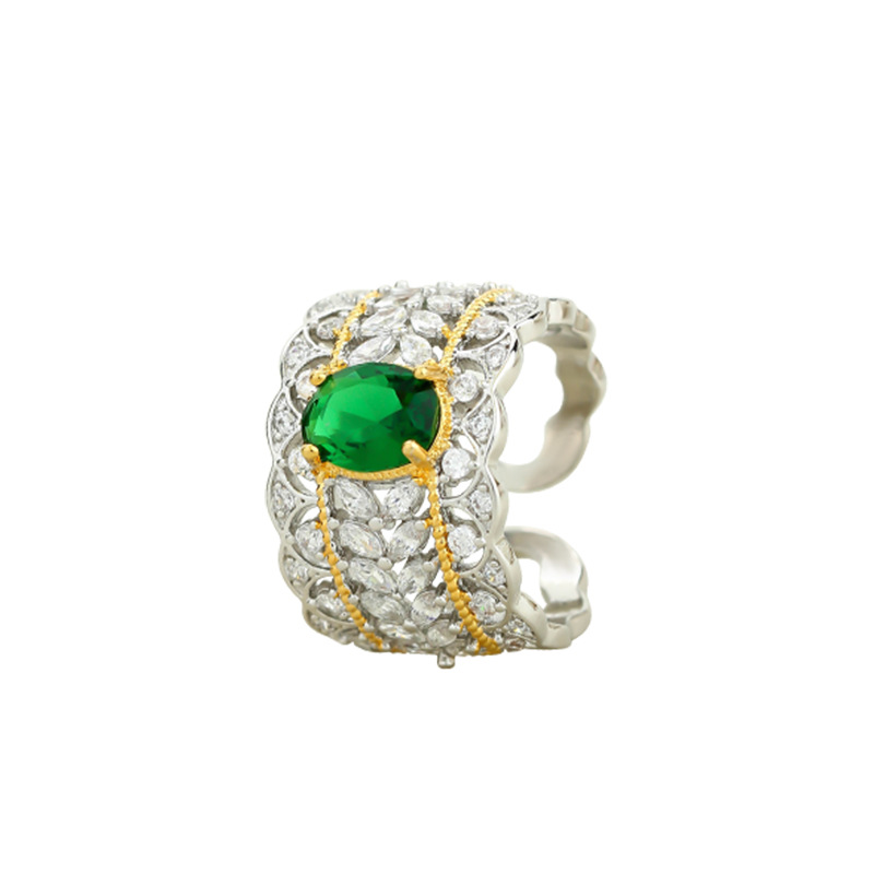 Italian Palace Hollow Pattern Double Color Gold Jewelry Lace Imitation Emerald Pigeon Egg Retro Style Ring