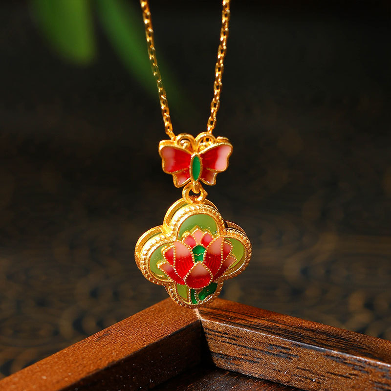 Real Gold Electroplating High Color Preservation Butterfly Love Flower Advanced Original Design Butterfly Love Flower Enamel Imitation Jade Clavicle Necklace Women