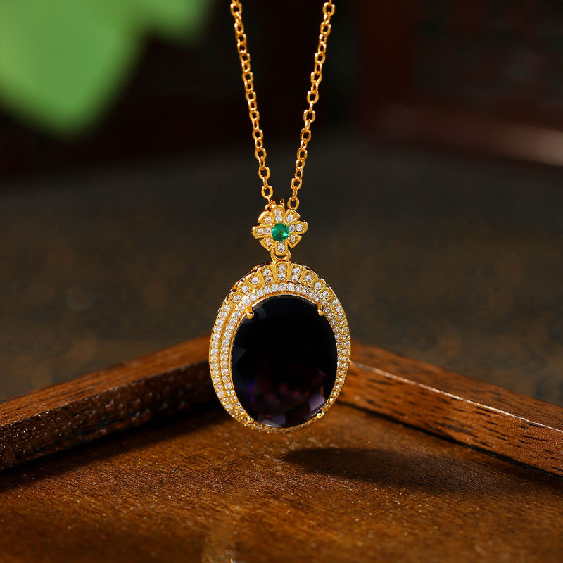 Retro full diamond light luxury high-grade violet gem pendant inlaid oval pendant color necklace live wholesale
