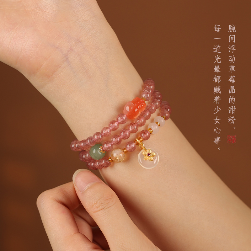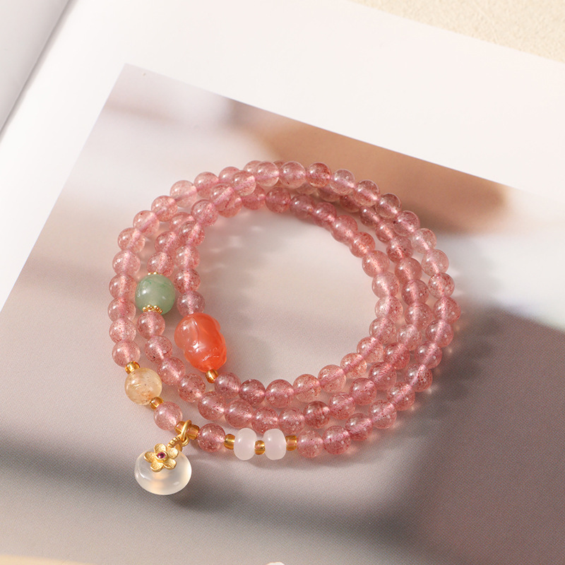 Strawberry Crystal Pixiu Multi-Circle Bracelet Attracts Rice Citrine Forest Style Female Sweet White Chalcedony Pendant Bracelet Manufacturer Wholesale