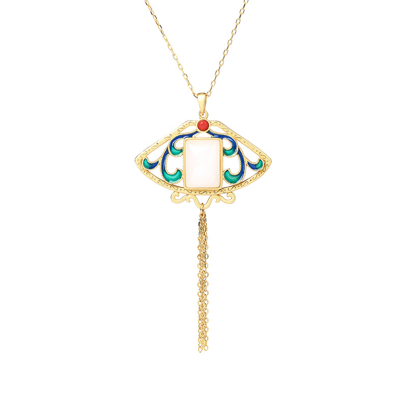 Summer 2022 New National Fashion Chinese Cheongsam Ancient Costume Jewelry Neck Chain Imitation Hetian Jade Palace Round Fan Tassel Necklace Women