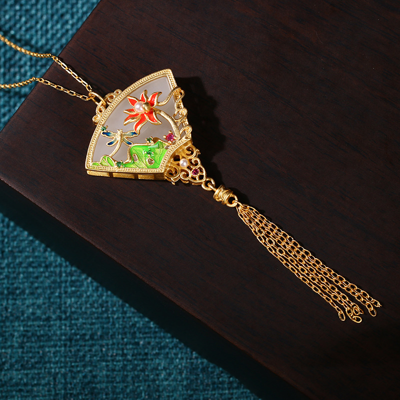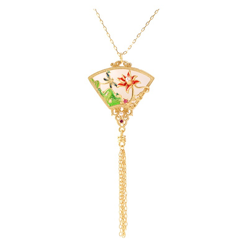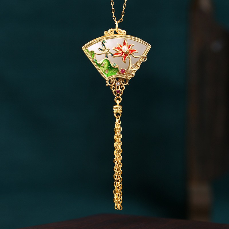 TikTok Express Live Selling National Tide Air-cooled Enamel Craft Inlaid Imitation White Jade Court Fan Tassel Necklace Women