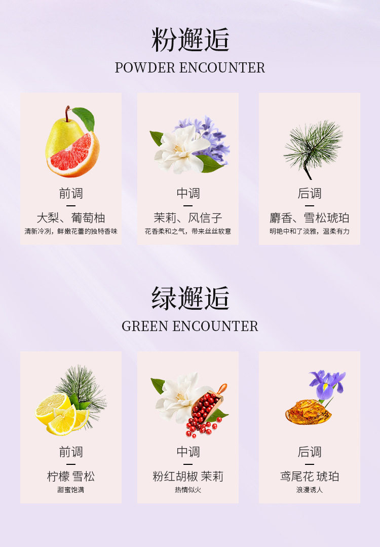| 颜色分类 | SLN-032B 粉邂逅 50ML,SLN032B-2 绿邂逅 50ML,SLN-032C 紫邂逅 50ML,YT-5133 粉邂逅 100ML,YT-5134 绿邂逅 100ML,YT-0904 粉经典邂逅 3ML,YT-0905 绿机遇邂逅 3ML,YT-1002-12 经典邂逅 2ML,YT-1002-03 机遇邂逅 2ML,SLN-1002-52 紫邂逅 2ML |